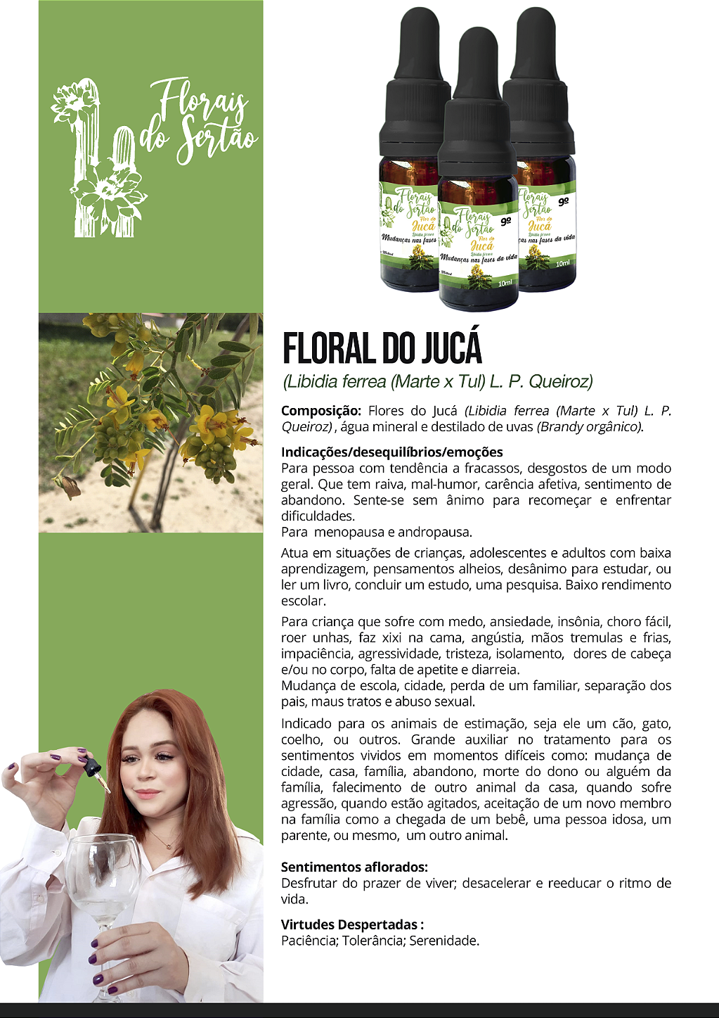 Composição: Flores do Jucá (Libidia ferrea (Marte x Tul) L. P. Queiroz) , água mineral e destilado de uvas (Brandy orgânico).