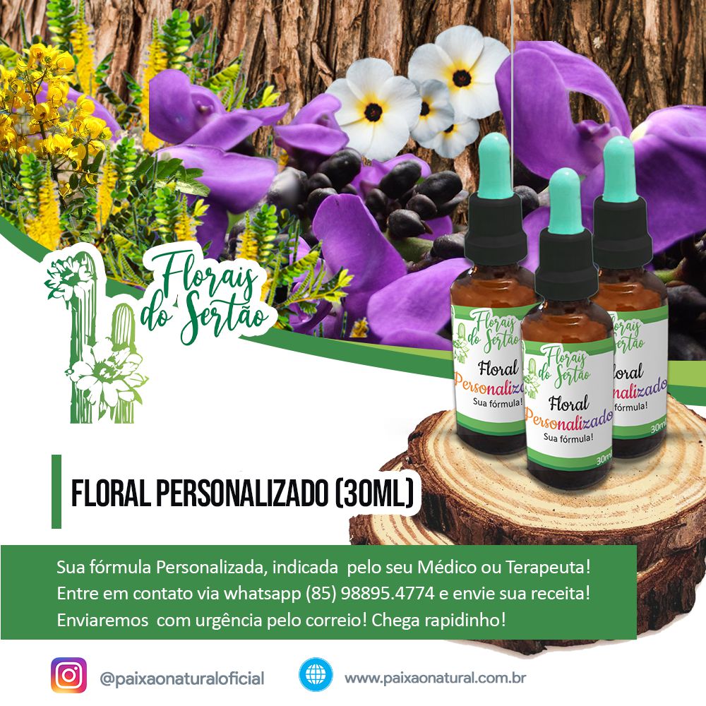 Fórmula Personalizada Florais do Sertão, em frasco de vidro âmbar com tampa, bulbo de silicone e pipeta de vidro (30ml).