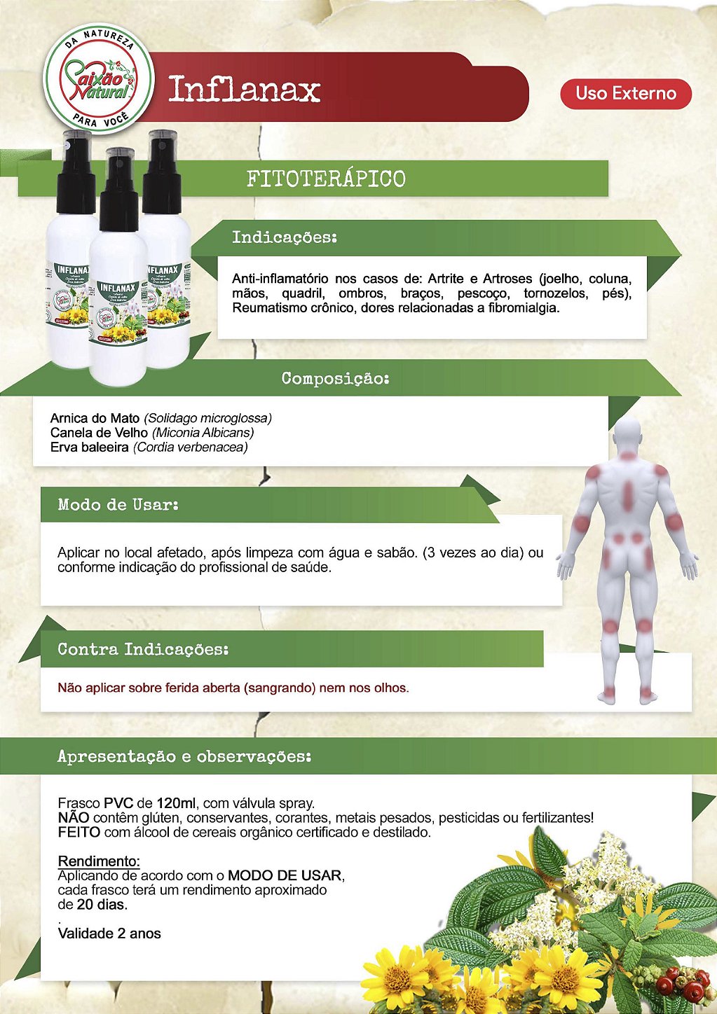 Anti-inflamatório nos casos de: Artrite, entorse, hematomas, pancadas, contusões, dores musculares, picadas de insetos e fibromialgias.